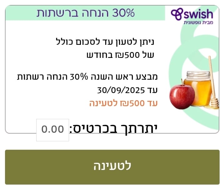 מבצע ראש השנה. ניתן לטעון עד 500 ש"ח.