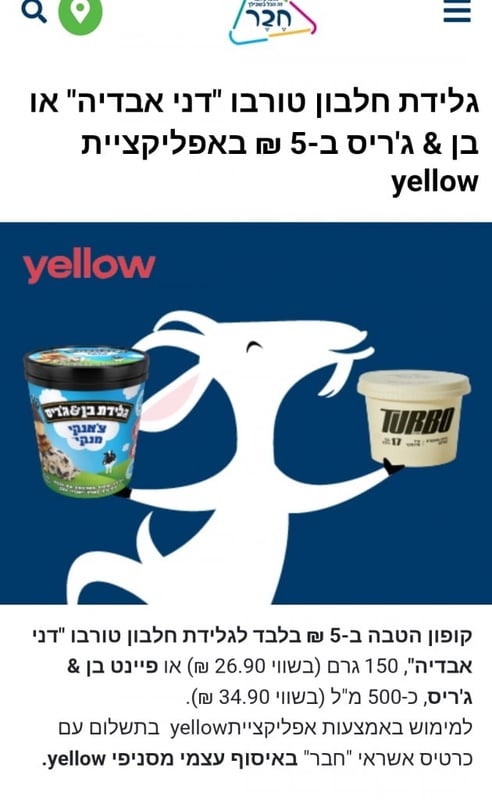 גלידת חלבון טורבו "דני אבדיה" או בן & ג'ריס ב-5 ₪ באפליקציית yellow לבעלי כרטיס אשראי חבר