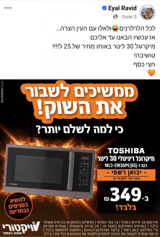 ויקטורי: מיקרוגל טושיבה 30 ליטר ב-349 ש'