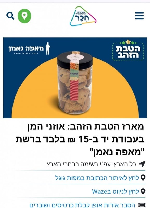 מארז בודד של אוזני המן (כ-320 גרם) בעבודת יד ב-15 ₪בלבד (במקום 40 ₪), ברשת "מאפה נאמן" במגוון מילויים: שוקוצ'יפס ,פלטינה - פטל ושוקולד לבן ,דובאי - פיסטוק ,פקאן ופרליני לוז , שוקולד קלאסי, תמרים, פרג, חלווה, נוגט, לוטוס. מארזים ללא סוכר: שוקולד, ריבה תות.