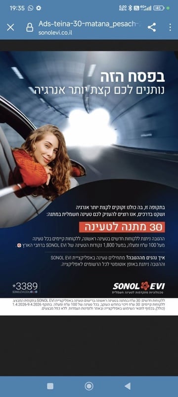 30 ש"ח מתנה לטעינה ההטבה ניתנת ללקוחות חדשים בטעינה ראשונה, ללקוחות קיימים בכל טעינה מעל 100 ש"ח ומעלה, במעל 1,800 נקודות הטעינה של SONOL EVI ברחבי הארץ.
