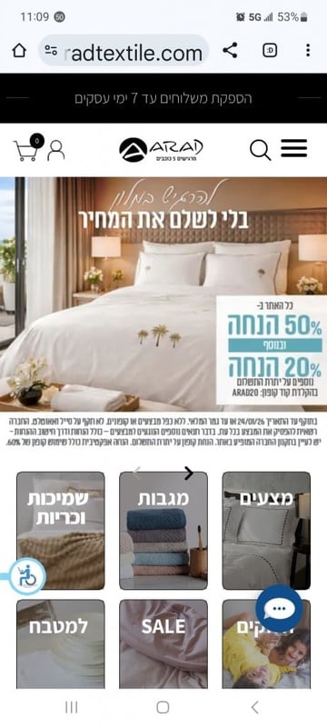 כל האתר ב-50% הנחה + 20% הנחה על היתרה בהקלדת הקופון ARAD20