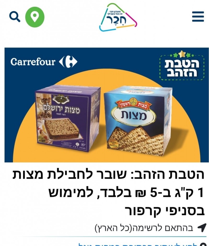 מועדון חבר- הטבת הזהב: שובר לחבילת מצות 1 ק"ג ב-5 ₪ בלבד, למימוש בסניפי קרפור