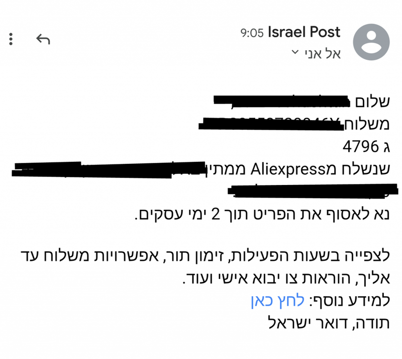 הודעה שקיבלתי הבוקר מדואר ישראל על משלוח טרי שנחת אצליהם בסניף