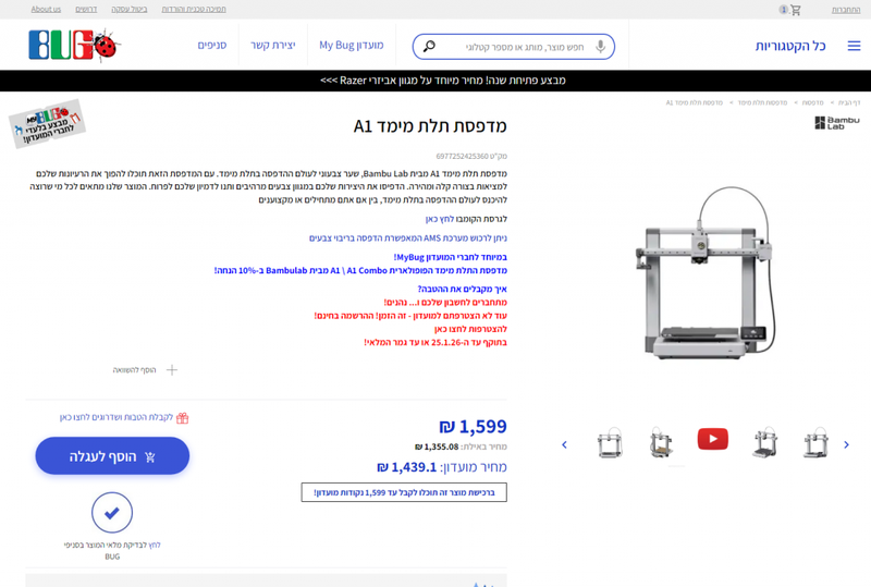באג: 10% הנחה על מדפסות תלת-ממד: Bambu Lab A1 + Bambu Lab A1 Combo