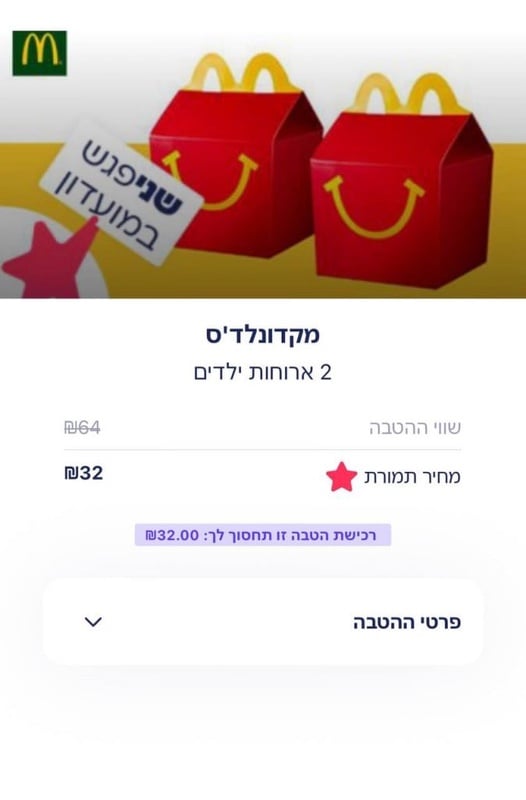 זוג אורחות ילדים מקדונלדס 50% הנחה ללקוחות ביטוח ישיר