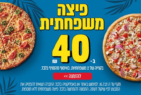 בקניית 2 משפחתיות. לא כולל תוספות. בתוקף עד 16.7.21. בהזמנה באתר או באפליקציה בלבד, באיסוף מהסניף בלבד.