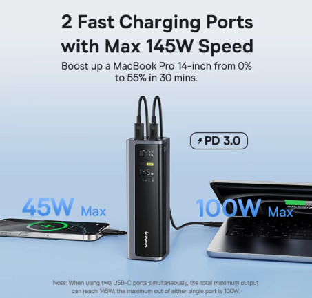 Baseus 145W Power Bank 20800mAh מטען נייד 100W + 45W