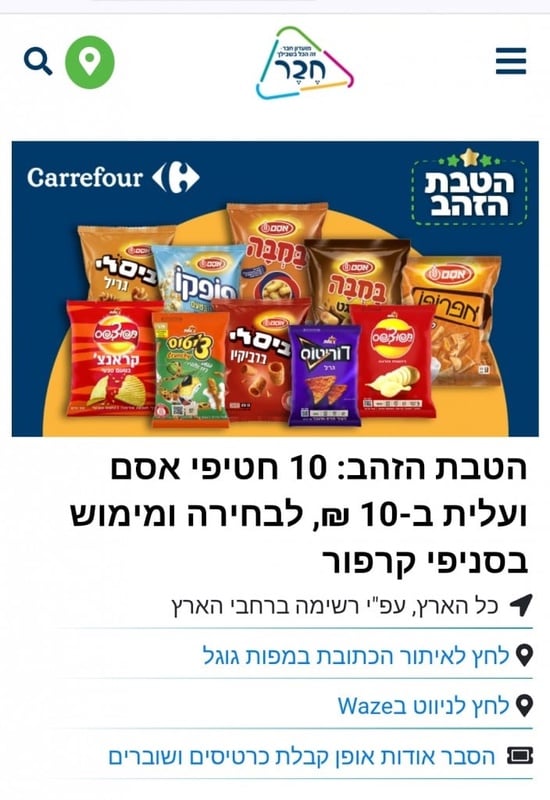 שובר לרכישת 10 חטיפי אסם ועלית ב-10 ₪ (במקום 38-59 ₪), לבחירה ומימוש בסניפי קרפור. לצפייה ברשימת הסניפים, לחצו >>