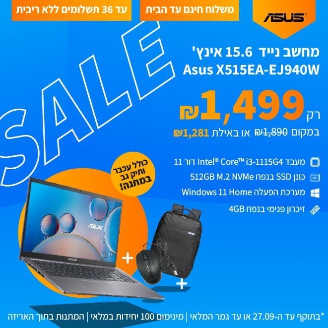 לפטופ "Asus X515EA 15.6 - רק ב-1,499 ש״ח + תוספות