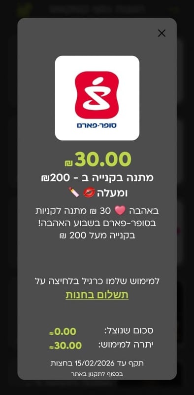 30 שקל מתנה לסופר פארם באפליקציית קשקאש בקנייה מעל 200 שקל