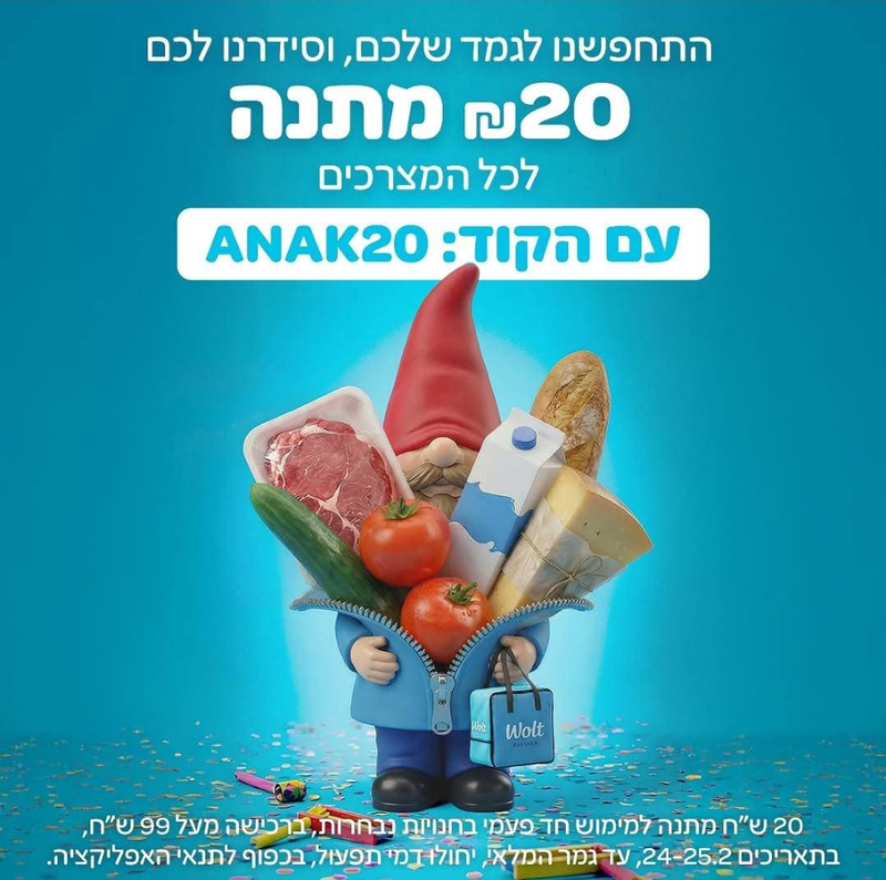 20 שקל מתנה לקניית מצרכים בוולט בהזמנה מעל 99 שקל במשלוח.