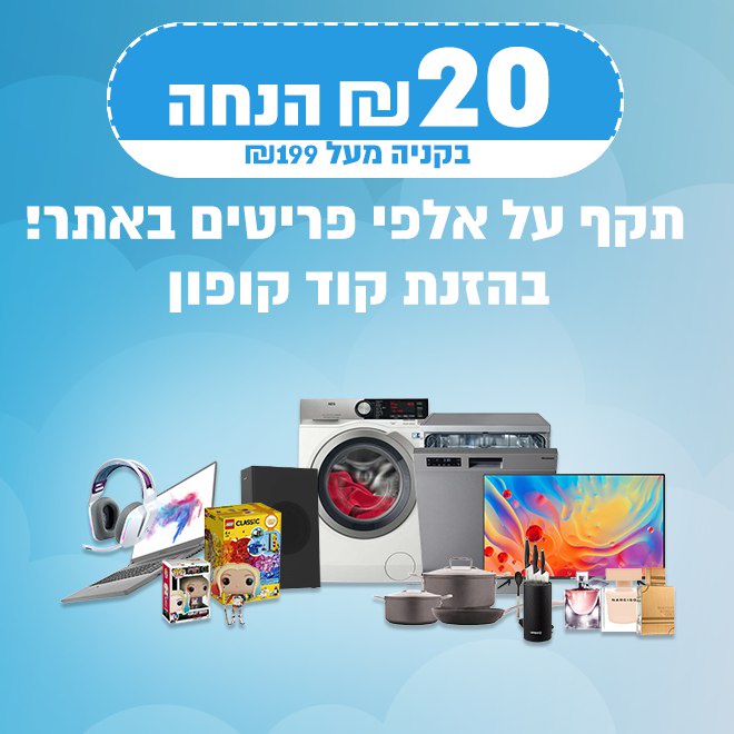 ₪20 הנחה בכל רכישה ב-₪199 או יותר מהמוצרים שבאתר!*