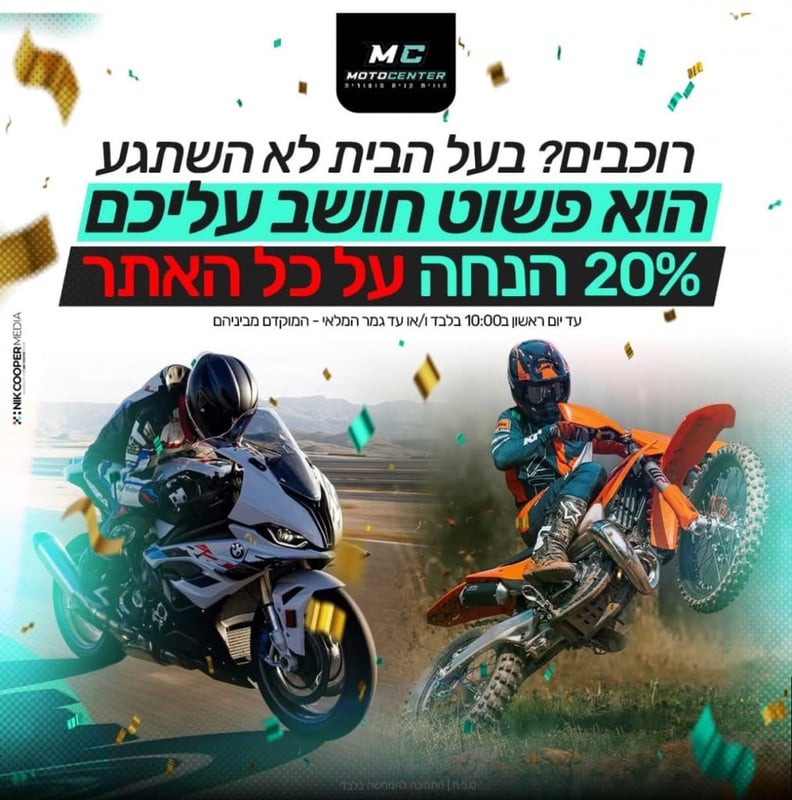 לרוכבי הדו"ג. 20% על כל האתר(לא כולל צמיגים) עד מחר ב 10:00, קופון 5MOTO נותן עוד 5% על היתרה