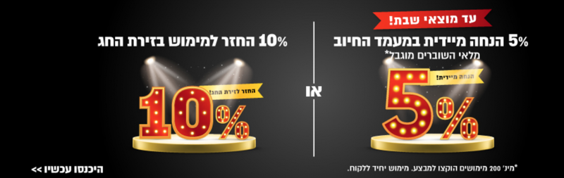5% הנחה מיידית בסל או 10% למימוש בזירת החג (לרוכשים ב499 שקלים ומעלה מכלללל האתר!):