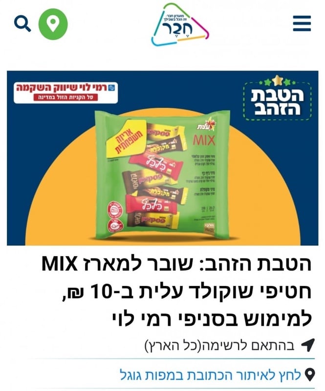 לחברי מועדון חבר - הטבת הזהב: שובר למארז MIX חטיפי שוקולד עלית ב-10 ₪, למימוש בסניפי רמי לוי