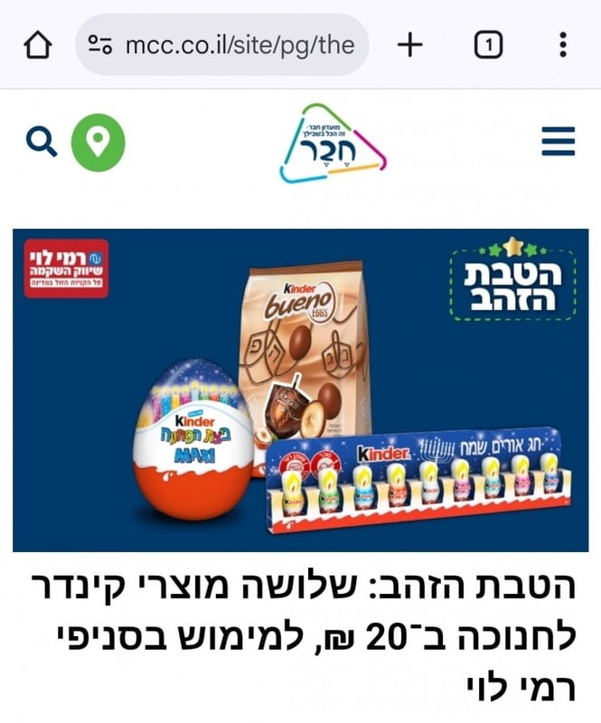 מועדון חבר- הטבת הזהב: שלושה מוצרי קינדר לחנוכה ב־20 ₪, למימוש בסניפי רמי לוי