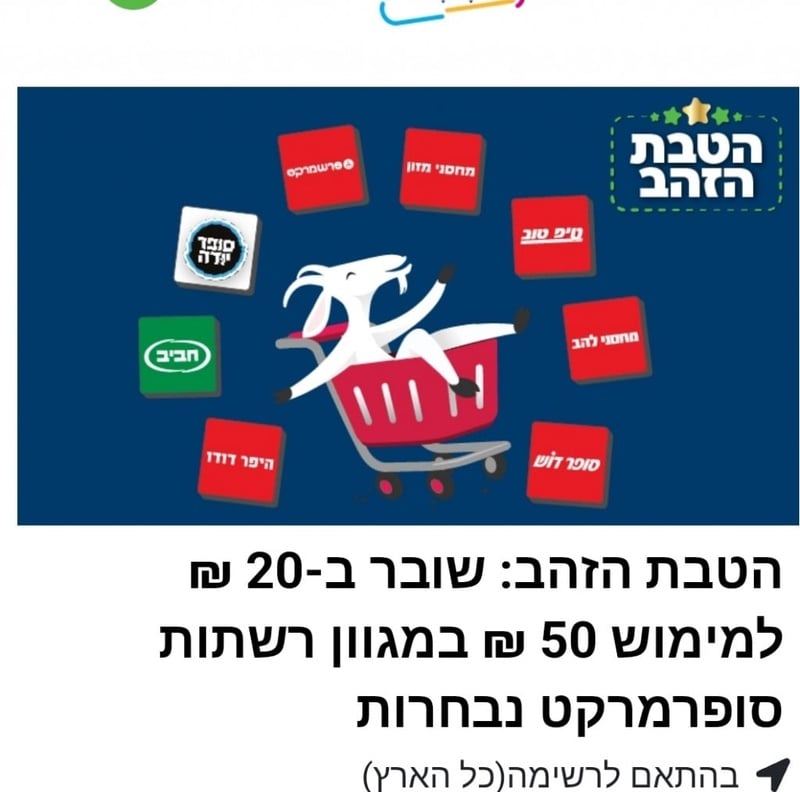 שובר ב-20 ₪ למימוש 50 ₪ לרכישה במגוון רשתות סופרמרקט נבחרות: פרשמרקט, סופר יודה, טיפ טוב, מחסני מזון, מחסני להב, היפר דודו, סופר דוש וסופר חביב