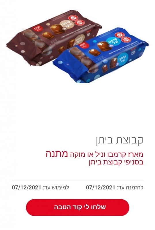 • מוסרים את קוד ההטבה בסניפי רשת מגה בעיר, יינות ביתן, מגה מרקט, ביתן מרקט ושוק מהדרין ומקבלים מארז קרמבו וניל או מוקה מתנה